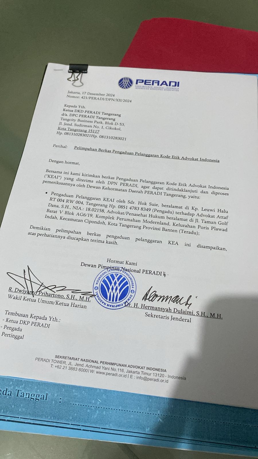 Hok Suie., mengapresiasi dan mengucapkan terimakasih kepada DPN PERADI, yang mana surat pengaduannya direspon cepat, hal tersebut berdasarkan surat Nomor: 421/PERADI/DPN/XII/2024. Prihal: Pelimpahan Berkas Pengaduan Pelanggaran Kode Etik Advokat Indonesia yang keluarkan oleh DPN PERADI pada tanggal 17 Desember 2024. dan di tanda tangani oleh R. Dwiyanto Prihartono, S.H., M.H., Wakil ketua Umum/Ketua Harian DPN PERADI dan Dr. H. Hermansyah Dulaimi. S.H., M.H., Sekretaris Jenderal DPN PERADI.